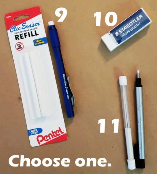 Clic retractable eraser (You will need some type of white plastic eraser. Either 9, 10 or 11 will serve you just fine for our course. I have all three and like them. Choose one or — even better — perhaps you already have one lying around somewhere! The Clic eraser is often sold with school supplies or office supplies.)