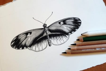 We will begin our exploration of carbon pencils with a tropical butterfly whose markings make him fun to draw: the toxic but lovely red postman, Heliconius erato. Carbon pencil has a special ability to mimic the texture of a butterfly’s wing. Prepare to be impressed!