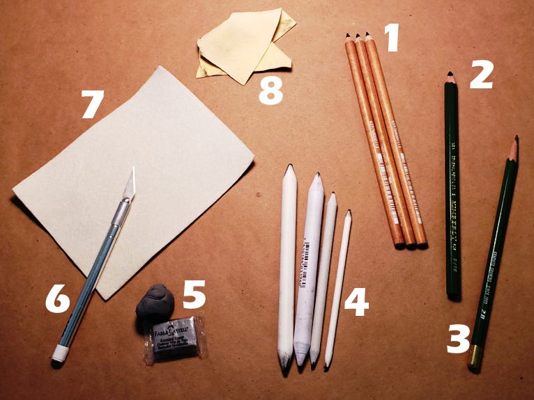 This course is designed to demonstrate the unique characteristics of carbon pencils. If you use graphite or charcoal instead, you will get very different results from what is demonstrated in our class videos. It’s OK to use substitutes for most of the items on our supply list, but carbon pencils are at the heart of the techniques we’ll be using. I strongly encourage you to use the four pencils recommended below.