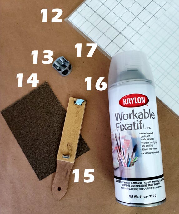 A sandpaper block. We will need to hone some extra-fine points and sandpaper will also allow us to trap carbon pencil dust to use for some drawing effects.